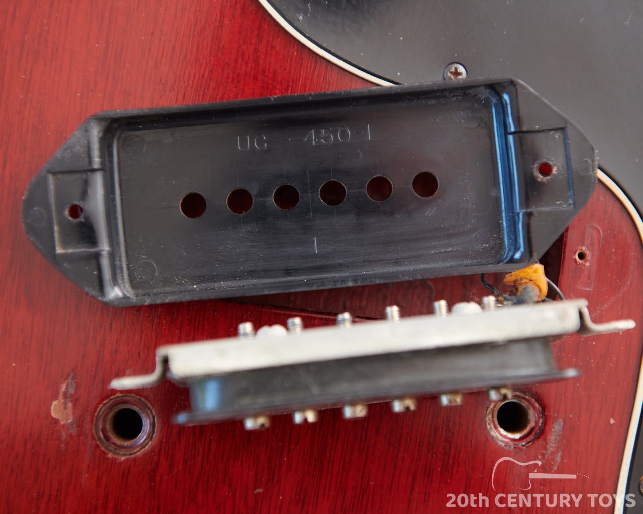 There is general playing wear on the back and sides of the neck, and a handful of small dinks and nicks as to be expected of a 60 year old guitar. But overall it is very clean and still retains a deep, un-faded cherry colour. At some point in the past a tremolo of unknown type has been fitted and there are four small screw holes on the guitar’s top as well as four small holes around the bottom strap button – see pictures. The wraparound tailpiece is a correct lightweight aluminium repro – we’d suspect that a different bridge was used when the tremolo was fitted and the original wraparound was subsequently lost.