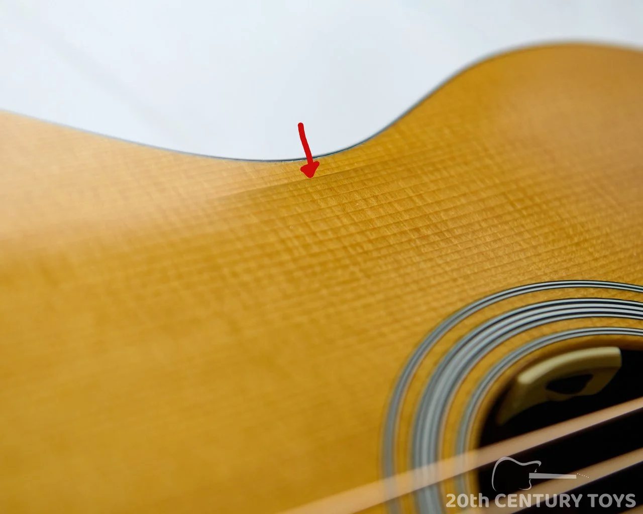 There is a minor, non-structural hairline surface crack along the edge of the spruce top, following the grain - see pictures. As a preventative measure the previous owner had a small internal cleat professionally installed. The repair is stable, unobtrusive, and has no impact on tone or structural integrity.